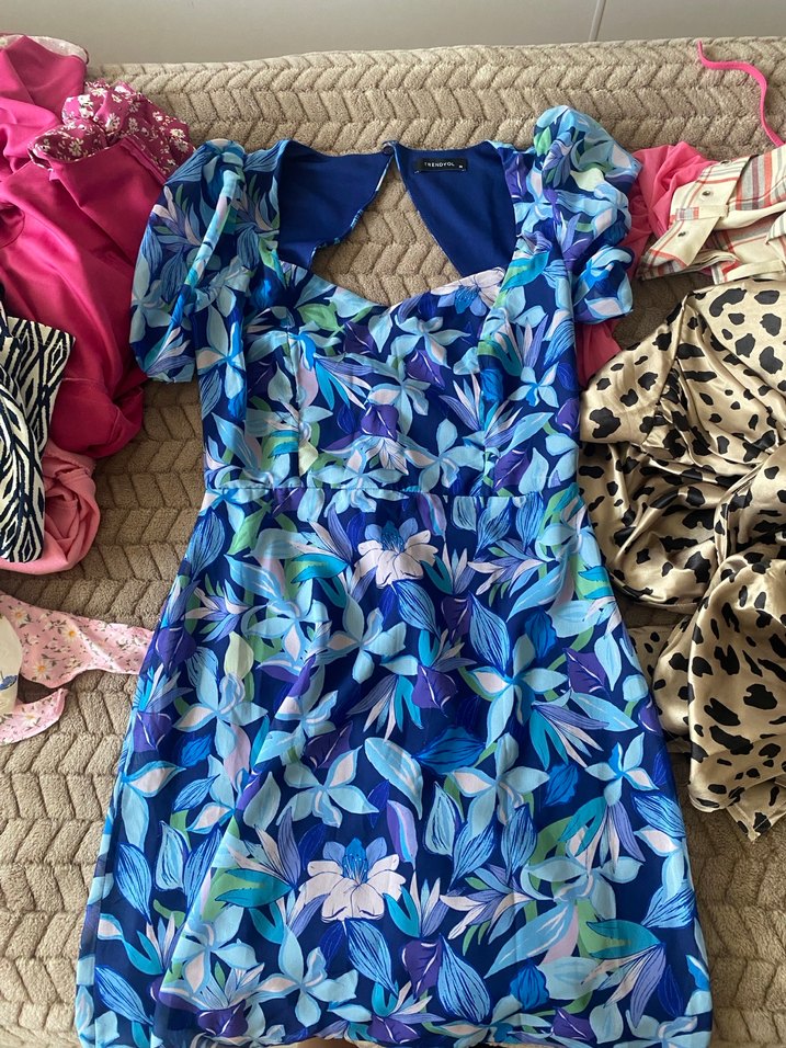 Mavi çiçek desenli, straplez yakalı, kısa kollu ve volan detaylı bohem tarzı midi elbisedir. Günlük kullanıma uygundur.