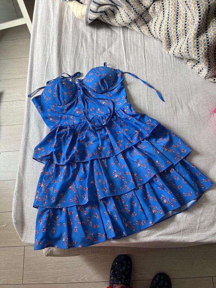 Mavi renkli, çiçek desenli ve kat kat volanlı straplez mini elbise, sentetik kumaştan, parti için uygun şık bir modeldir.