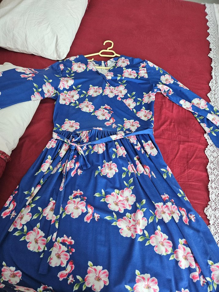 Mavi renkli, çiçek desenli uzun elbise, bol kesim, uzun kollu, V yaka ve fırfır detaylara sahiptir. Bohem tarz için uygundur.
