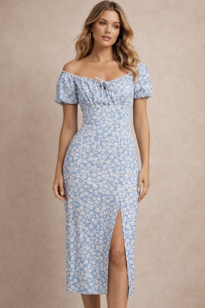 Mavi pastel çiçek desenli, V yaka ve askılı kollu, drapeli uzun ve vücuda oturan bohem elbisedir.
