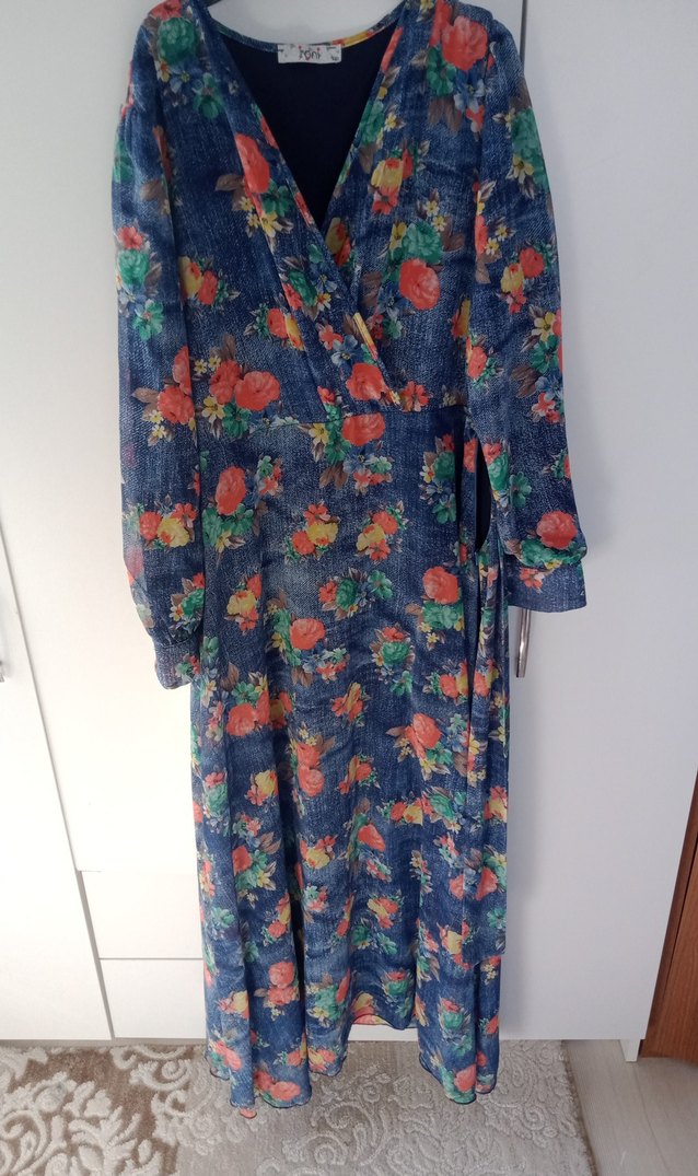 Uzun kollu, bol kesim kadın elbisesi, koyu mavi zemin üzerine çiçek desenleriyle vintage ve bohem tarzını yansıtıyor.