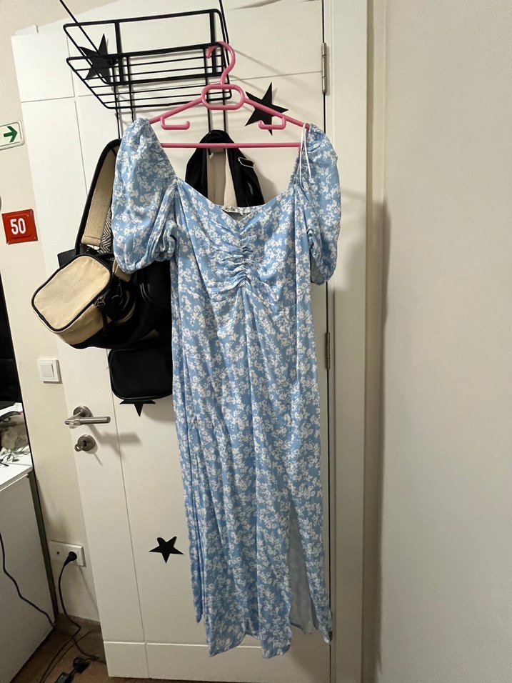 Mavi renkli cicekli,midi boy elbise. vucudu saran drapeli tasarıma sahip,kollari ister düşük ister normal şekilde kullanılabılır. Yumuşak sentetik kumaştan üretilmiştir.