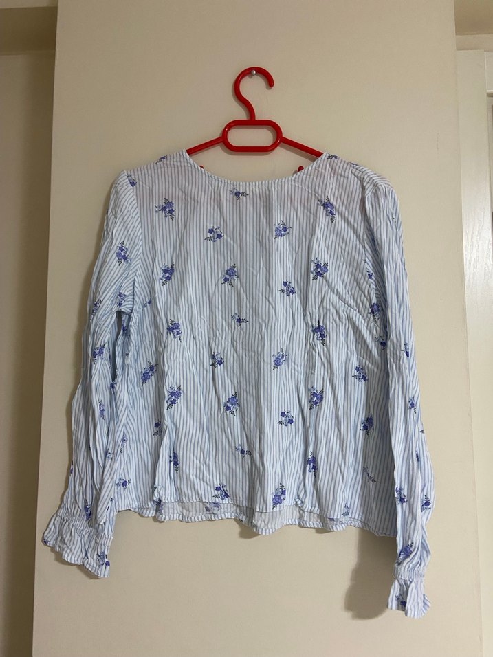Uzun kollu, yuvarlak yaka ve bol kesim pamuk bluz. Pastel mavi çizgili ve küçük çiçek desenleriyle günlük kullanıma uygun.