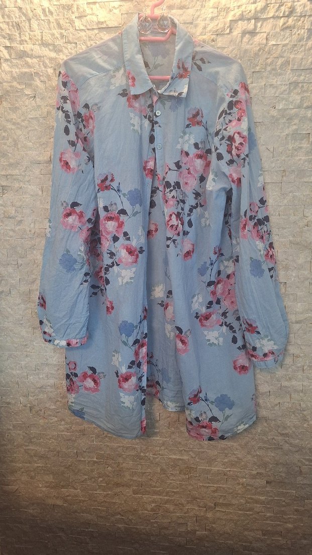 Mavi pamuklu gömlek, bol kesim, uzun kollu ve çiçek desenlidir. Düğmeli ön ve kayık yaka detaylı, bohem tarzda. Günlük kullanım için uygundur.