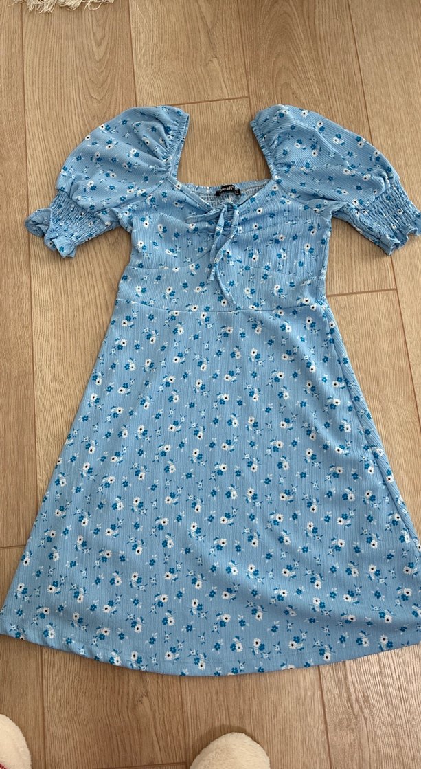Kısa balon kollu, mavi çiçek desenli, bohem tarza uygun oturan midi elbise. beden 37. bel 36. boy 89