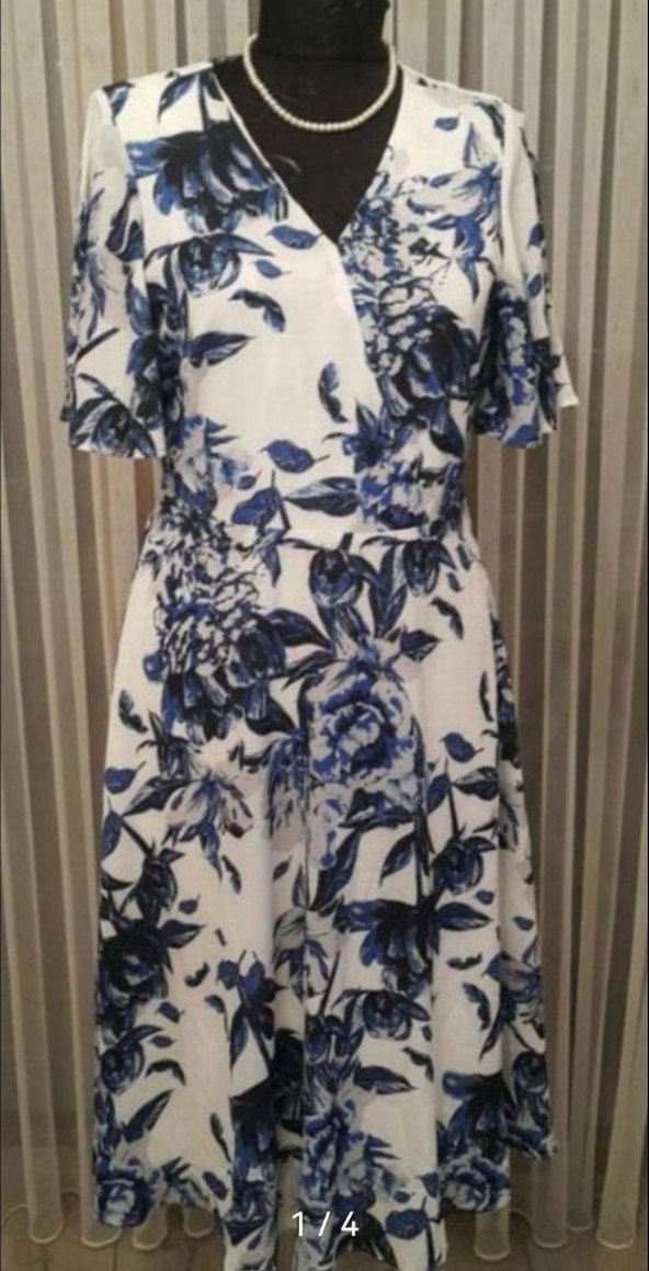Mavi çiçek desenli, kısa kollu, V yaka uzun ve bol kesim elbise. Yumuşak sentetik kumaştan, drapeli ve Paris usulü bohem tarzda. Ofis için uygun.