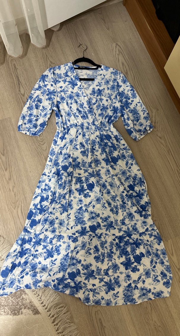 Bohem tarzda, mavi çiçek desenli, V yakalı, kısa kollu ve bol kesim uzun elbise, fırfır detaylıdır.