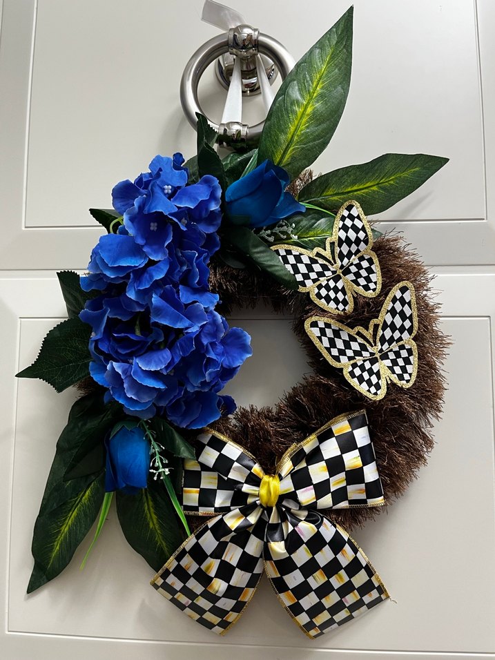 Koyu mavi çiçekler, büyük yeşil yapraklar ve kareli fiyonk ile kelebekler içeren canlı kapı süsü. Tüm ürünlerimiz el yapımı kendi üretimimizdir. Yeni Sıfırdır