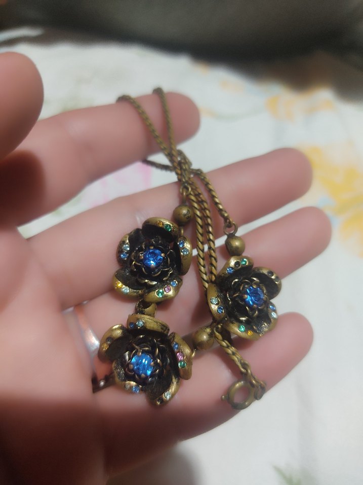 pirinç 1930-1940 arası Vintage mavi çiçek desenli ve boncuk detaylı kolye. Bohem ve gotik tarzlar için uygun, normal uzunlukta özel yapim zincirle şık bir seçim. yurt dışı sitelerinde 40 bine kadar fiyat gördüm benzer modellerde.Turkiye de benzerine bile rastlamadım #vintage #kolye #antika #antikakolye