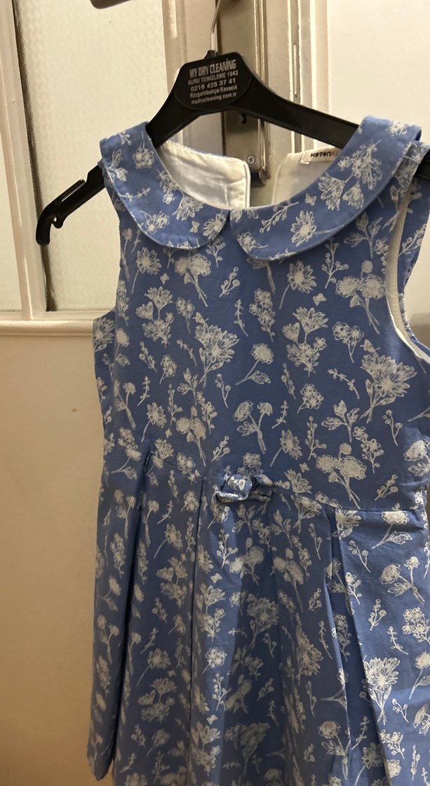 Mavi ve gri çiçek desenli, yakalı ve düğmeli vintage tarzda, kolsuz, dar kesim kız elbisesi. 7-8 yaş