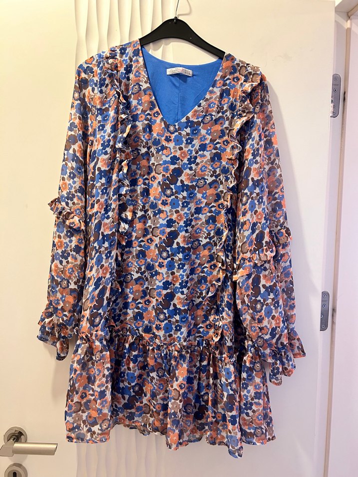Mavi çiçek desenli, volan detaylı, V yakalı, uzun kollu, bol kesim mini elbise. Yumuşak sentetik kumaştan, bohem tarz için uygundur.