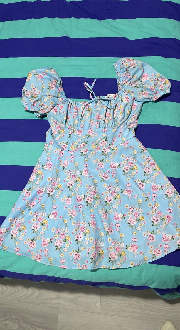 Mavi çiçek desenli mini elbise, bohem tarzda şık