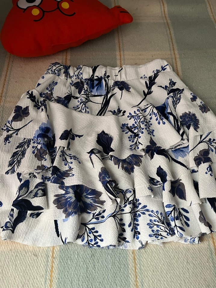 Bohem tarzı, mavi çiçek desenli ve volan detaylı, bol kesim mini etek. Sorunu vs yokdur çok az giyilmiştir