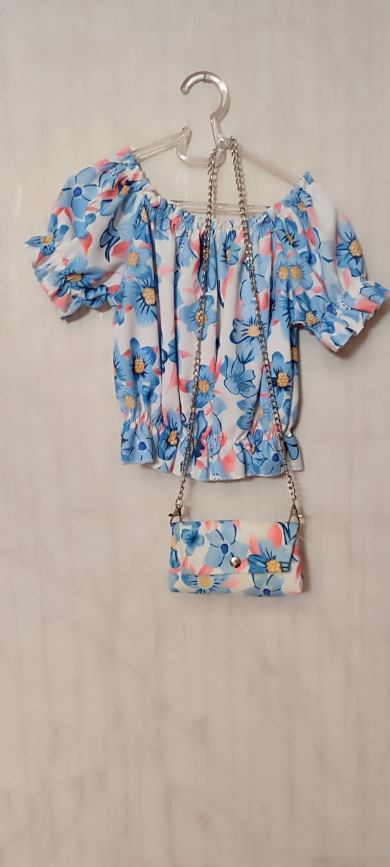 Rahat kesim, straplez kısa kollu bluz, pastel mavi çiçekli tie-dye desenli. Zincir detaylı, günlük sokak stili için uygun. çantalı. ihraç fazlası sıfır etiketsiz. 6-7-8 yaş uyumlu