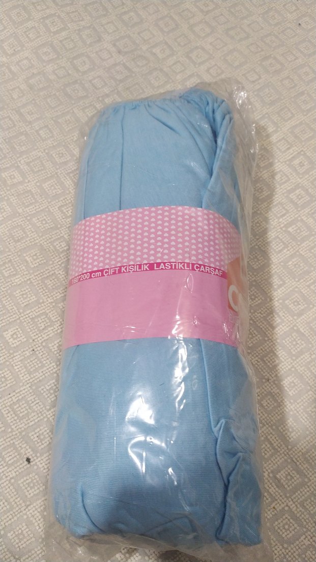 Pastel mavi renkte, çift kişilik, lastikli kenarlarıyla sabit duran çarşaf. ️