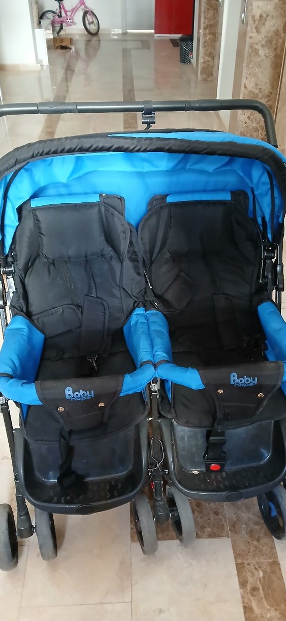 Mavi renkli çiftli bebek arabası, emniyet kemerli ve tam yatışlı koltuklara sahiptir. İki çocuk için tasarlanmıştır ve güneşlikli koruma sunar. çift yönlü kendinize çevirip de kullanabilirsiniz. Zaten bu özelliği için almıştım ama kısa bir süre kullandık 1 sene bile olmadı alalı yazın kullandım. Temiz sorunsuz baby hope marka