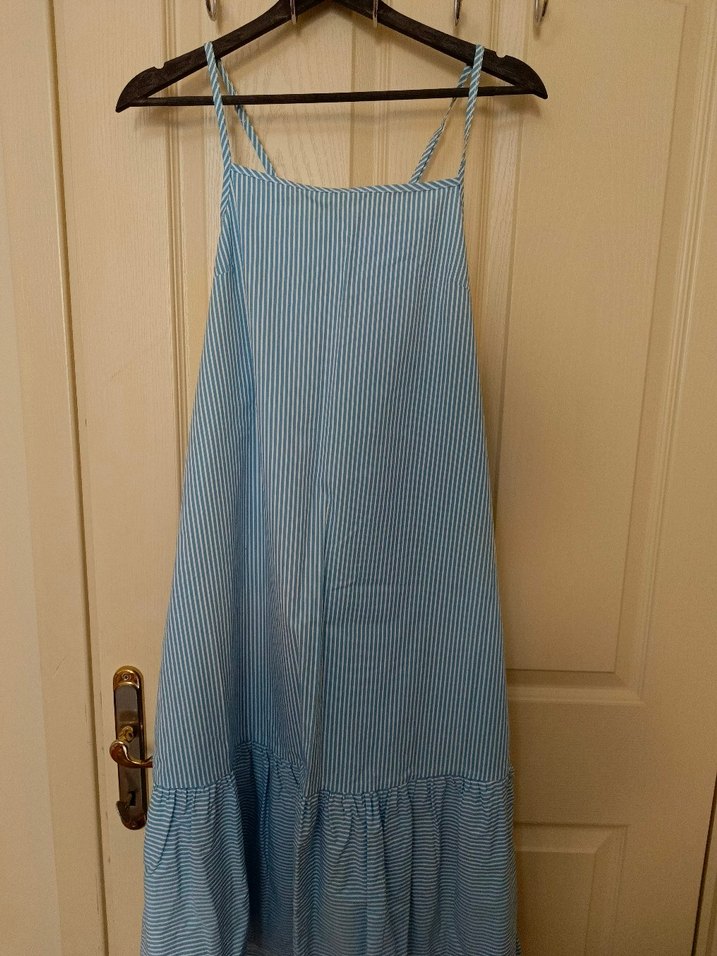 Pamuklu, mavi çizgili, askılı bol kesim midi elbise. Etek kısmında fırfır detayı bulunur, bohem tarzına uygundur. İki koltukaltı arası 43 cm Koltuk altından itibaren etek boyu 90 cm dır.