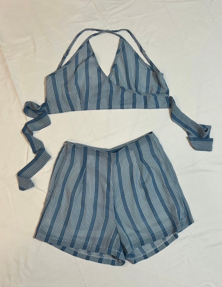 Mavi Çizgili Askılı Şort Takım