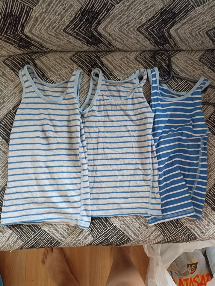 1-2 yaş. Az kullanildi. Temiz. 3 u beraber verilecektir. Belirtmek istiyorum. ortadaki bi tık daha küçük. Pamuk kumaştan, mavi ve gri çizgili, tekne yaka, fitted kesim bebek atletler, günlük rahat kullanım için uygun.