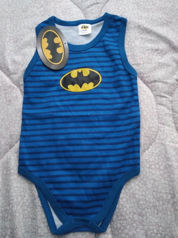 Mavi çizgili ve Batman logosu olan, askılı ve yuvarlak yakalı bebek erkek body. Ürün orjinal Disney lisans lı
