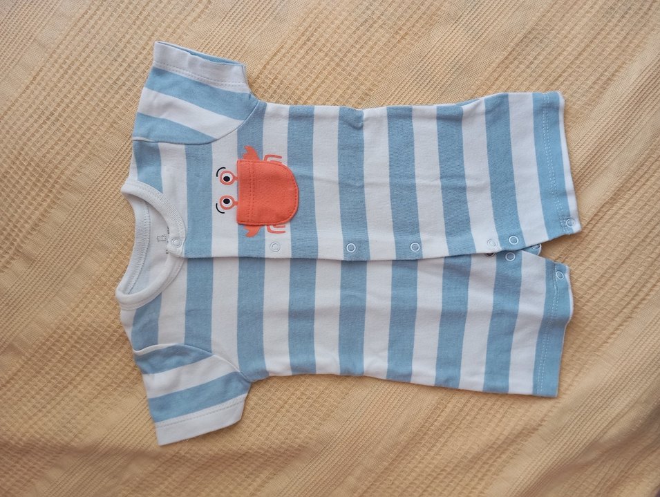 Kısa kollu, bisiklet yaka ve düğmeli bebek tulumu. Mavi beyaz çizgili, renkli yengeç baskılı, yumuşak kumaştan yapılmıştır.