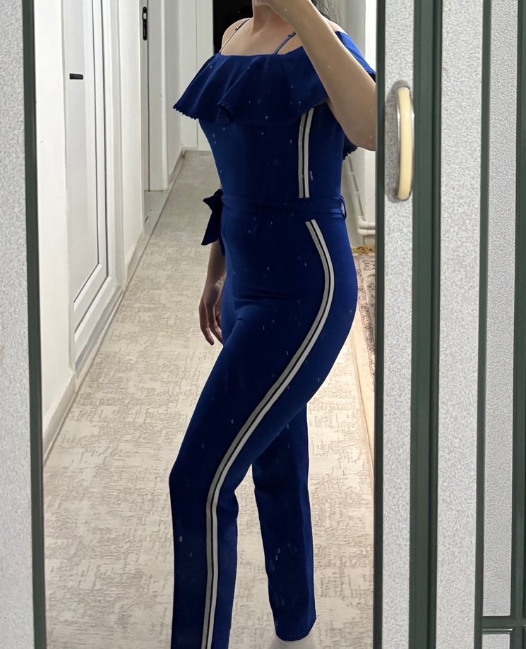 Mavi,çizgili desenli, bel detaylı tulum, ofis ve sokak stiline uygundur. Strappy askıları vardır.