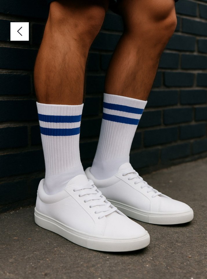 Mavi çizgili beyaz kalın çorap , regular fit, athleisure tarzına uygun. Rahat ve günlük kullanıma elverişli. Mavi siyah yeşil ve gri çizgili modeller mevcuttur.