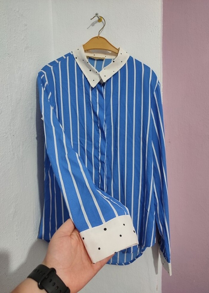 L beden çizgili mavi bluz gömlek