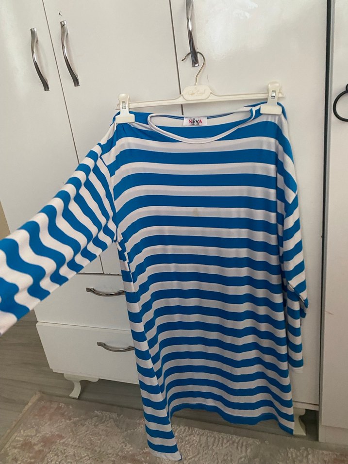 Uzun kollu, mavi-beyaz çizgili, Salaş kesim, tekne yaka ve drapeli tasarıma sahip. Günlük kullanıma uygun. Önünde küçük bir leke var ben çıkartmak için uğraşmadım çıkar bence