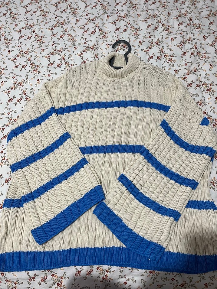 Boğazlı, uzun kollu, gevşek kesim örme kazak. Krem rengi üzerinde açık mavi yatay çizgilerle casual sokak stiline uygun. Salaş duruyor