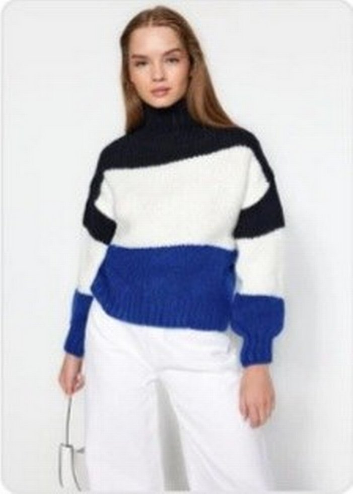 sadece bir defa kullanıldı,yumuşacık bir kazak,boğazlı, uzun kollu ve bol kesim mavi, beyaz ve siyah çizgili triko kazak, günlük kullanım için uygundur.