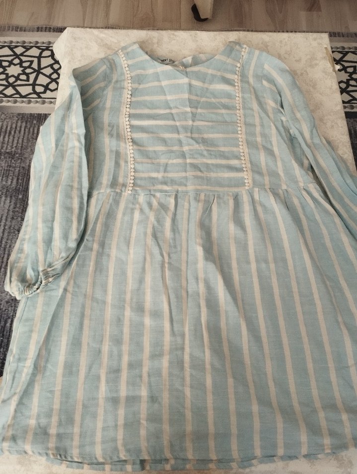 Mavi çizgili, uzun kollu, tekne yaka bohem hamile tunik. Nakışlı ve pileli detaylarla rahat ve bol kesim, yumuşak keten kumaştan.