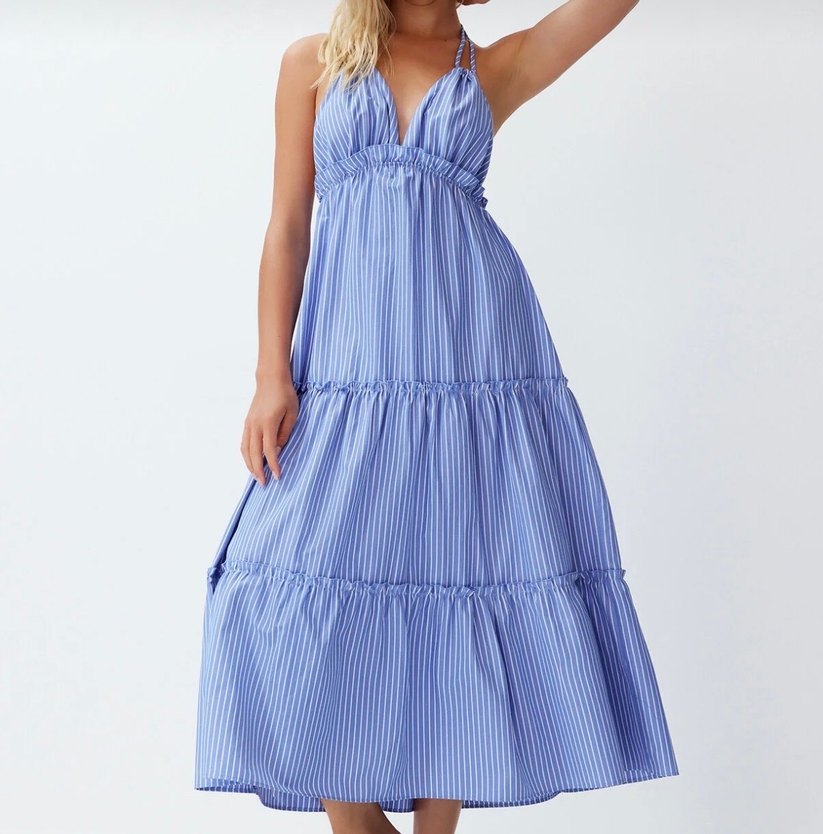 Mavi çizgili, V yakalı, askılı ve pile detaylı uzun elbise. Rahat kesimi ve yumuşak sentetik kumaşıyla bohem tarzını yansıtır. 1 kez giyildi tertemiz ürün 42 beden hiçbir kusuru yoktur yeni gibi yazlık elbise