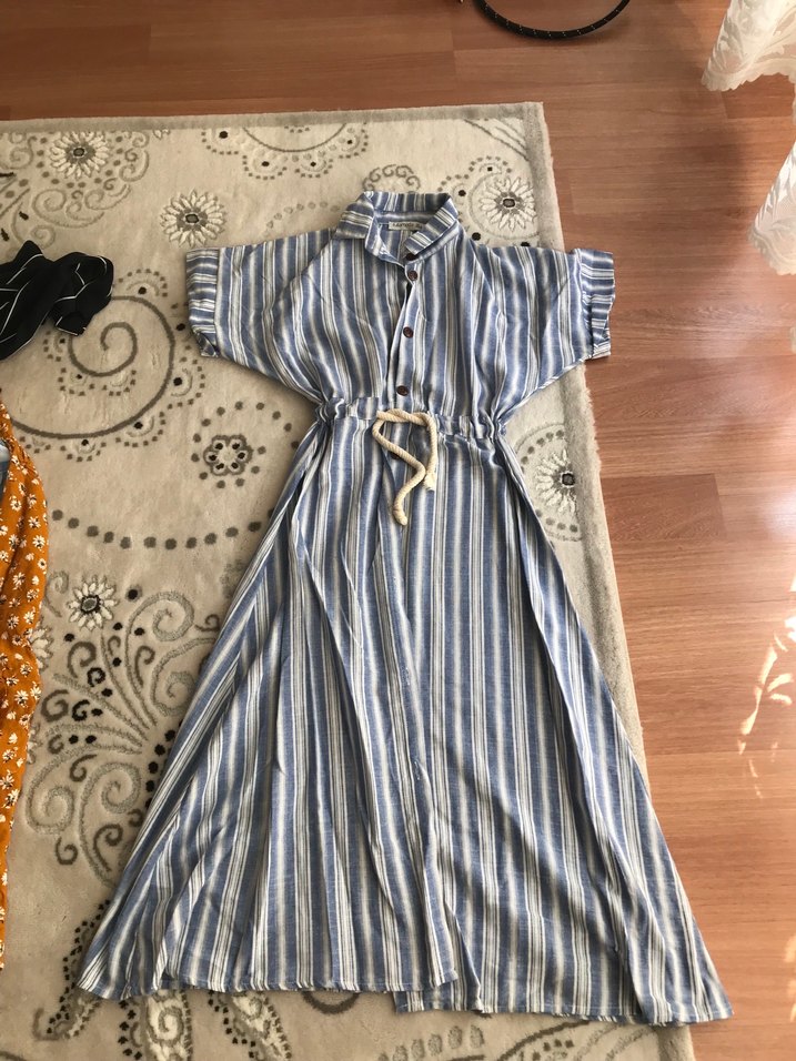 Mavi çizgili uzun keten elbise, bol kesim, pile detaylı, kısa kollu ve yakalıdır. Hafif kumaştan, günlük kullanıma uygundur.