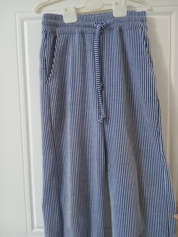 Mavi ve gri çizgili, bol kesim, pilili uzun kadın keten pantolon. Yumuşak keten kumaştan, günlük rahatlık ve casual stil sunar.