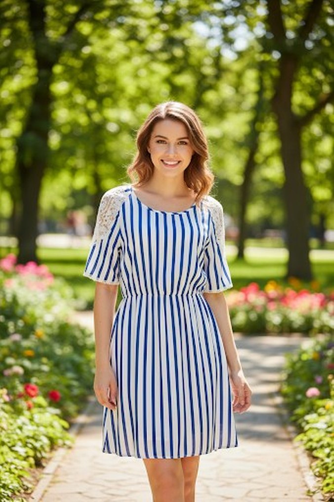 Dantel detaylı kısa kollu, mavi çizgili midi elbise. Kayık yaka ve rahat kesimle günlük dış mekan kullanımı için uygundur.