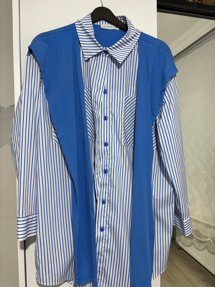 Drapeli mavi ve çizgili desenli, uzun kollu ve yakalı kadın gömleği. Midi boyda, rahat kesimli ve Paris sokak modasına uygun şık bir parça. ✨