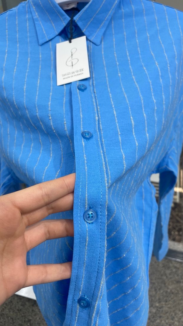Mavi renkte, düğmeli ve yakalı pamuk erkek gömlek. Uzun kollu, normal boyda ve parlak çizgili desene sahip, günlük kullanım için uygundur.