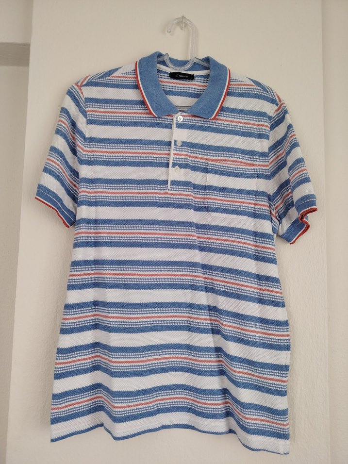 Kısa kollu, düğmeli yakaya sahip erkek polo tişörtü. Mavi pastel çizgili deseni ve bol kesimiyle günlük rahat kullanım için uygundur.