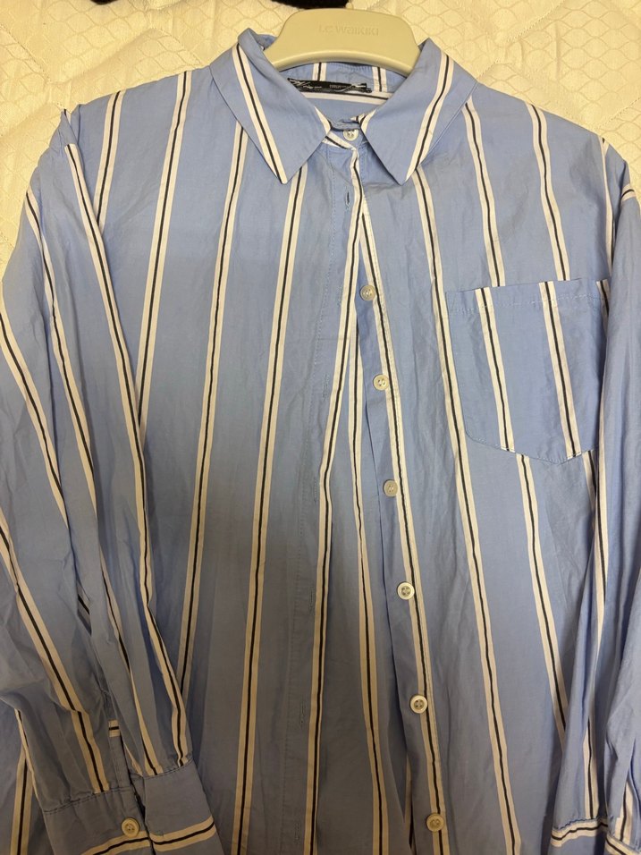 Mavi çizgili pamuklu, düğmeli, uzun kollu ve yakalı gömlek. Normal boy ve regular fit, günlük sokak stili için ideal. 2 defa tek giyindim yeni sayılır