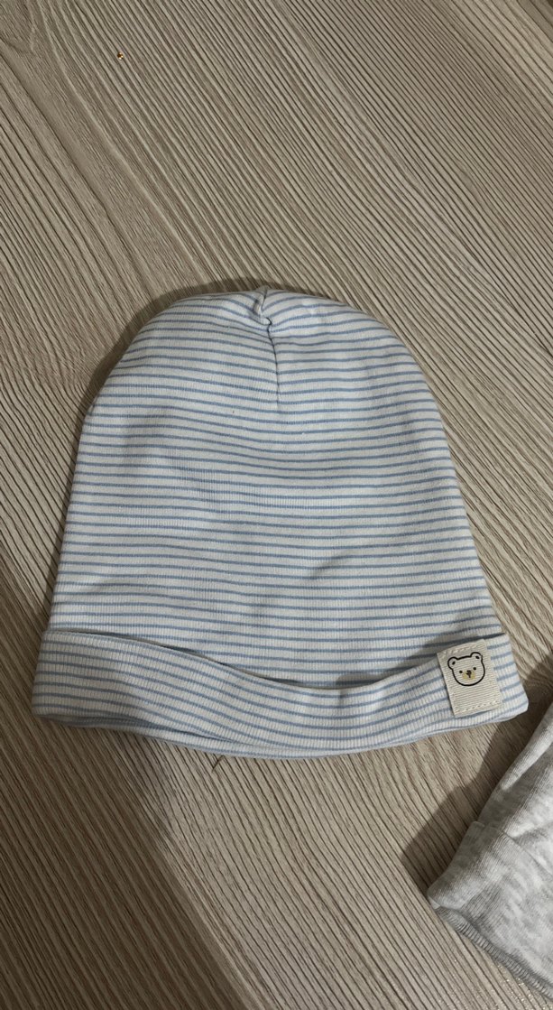 Yumuşak kumaştan, ince mavi çizgili ve küçük ayı detaylı erkek bere. Rahat bir stil için uygundur.