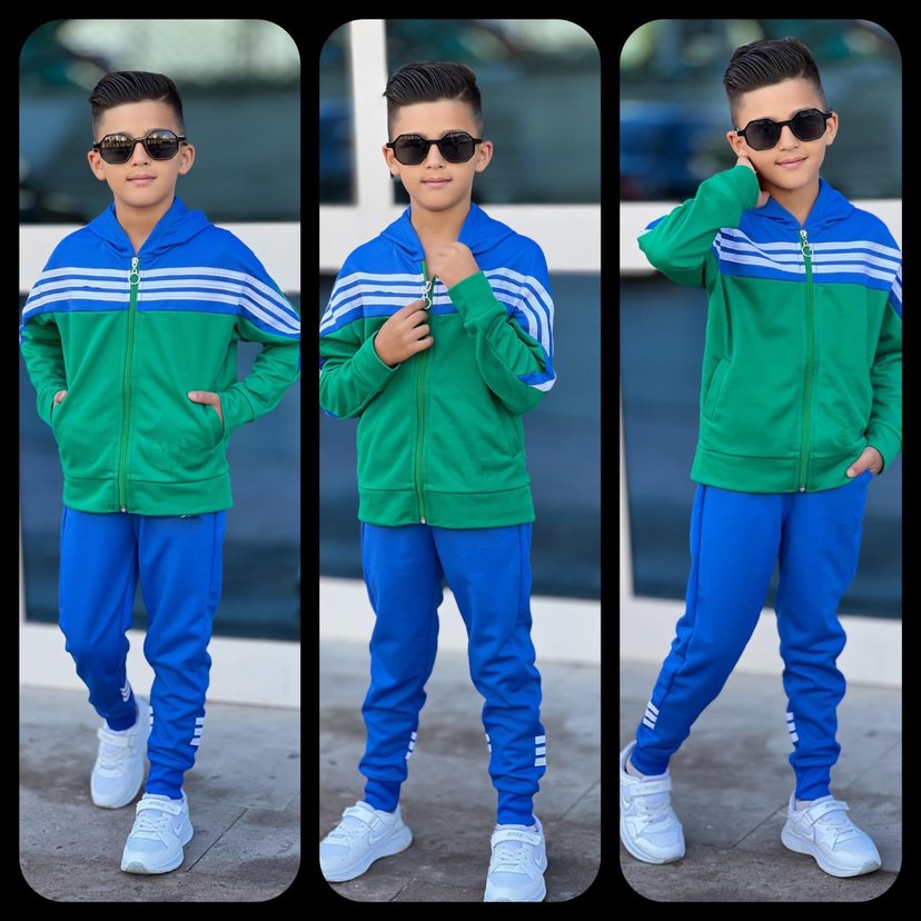 Mavi ve yeşil renklerde çizgili, yüksek yakalı ve rahat kesimli erkek çocuk eşofman takımı, yumuşak ve sıcak kumaştan üretilmiştir.