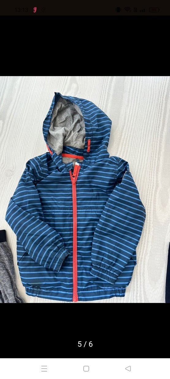 Fermuarlı ve kapüşonlu, yumuşak fleece kumaştan yapılmış, mavi çizgili ve içi gri astarlı, dar kesim erkek çocuk yağmurluğu. ️