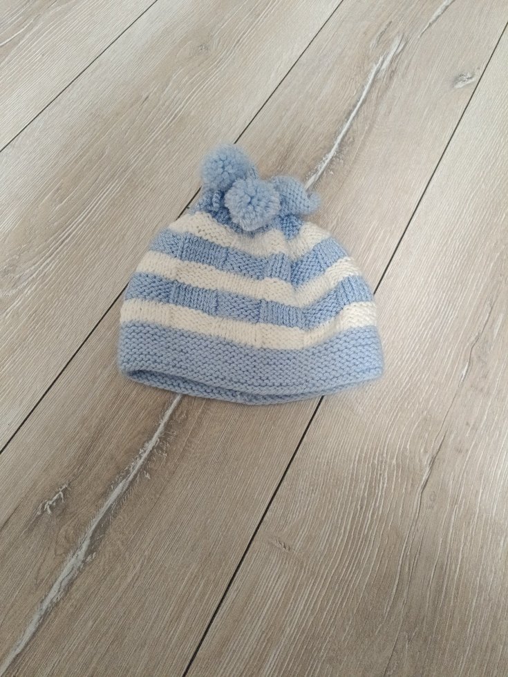Pastel mavi ve beyaz çizgili, iki ponponlu örgü erkek çocuk bere, yumuşak ve sıcak tutar.