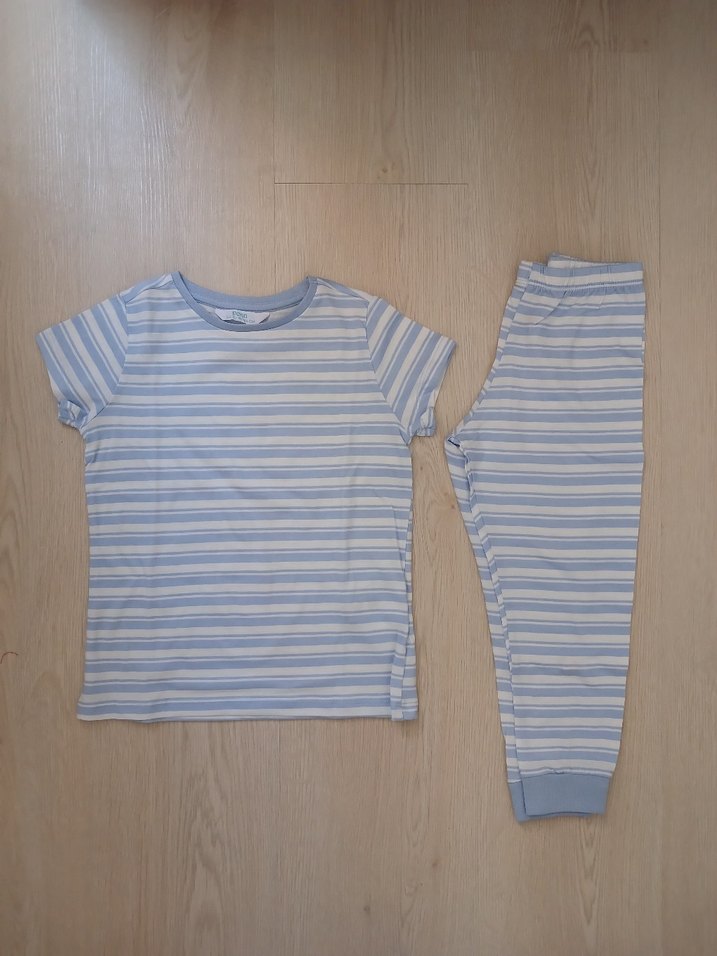 Mavi pastel çizgili, kısa kollu ve bisiklet yaka pijama takımı. Pantolonlar bilekte lastikli , rahat kesim.