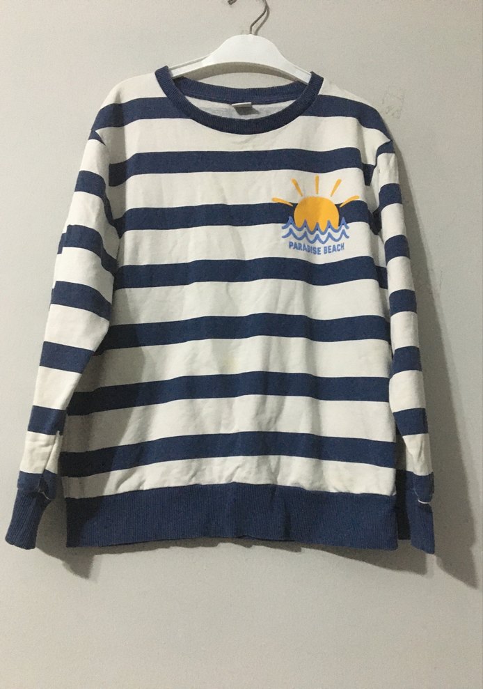 Uzun kollu, yuvarlak yaka ve bol kesim mavi beyaz çizgili erkek çocuk sweatshirtü. Örgü dokulu, yumuşak ve sıcak kumaştan, baskılı güneş ve dalga deseni ile rahat bir sokak giyimi parçası. ☀️
