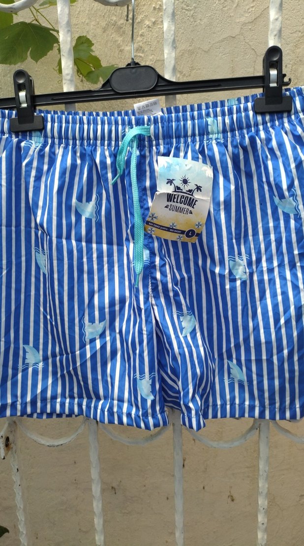 Renkli mavi çizgili, baskılı desenli ve pileli detaylı bol kesim erkek mini plaj şortu, rahat bohem tarzı sunar. etiketinde L beden yazılı fakat kalıbı biraz dar , onun için M bedene daha iyi olur