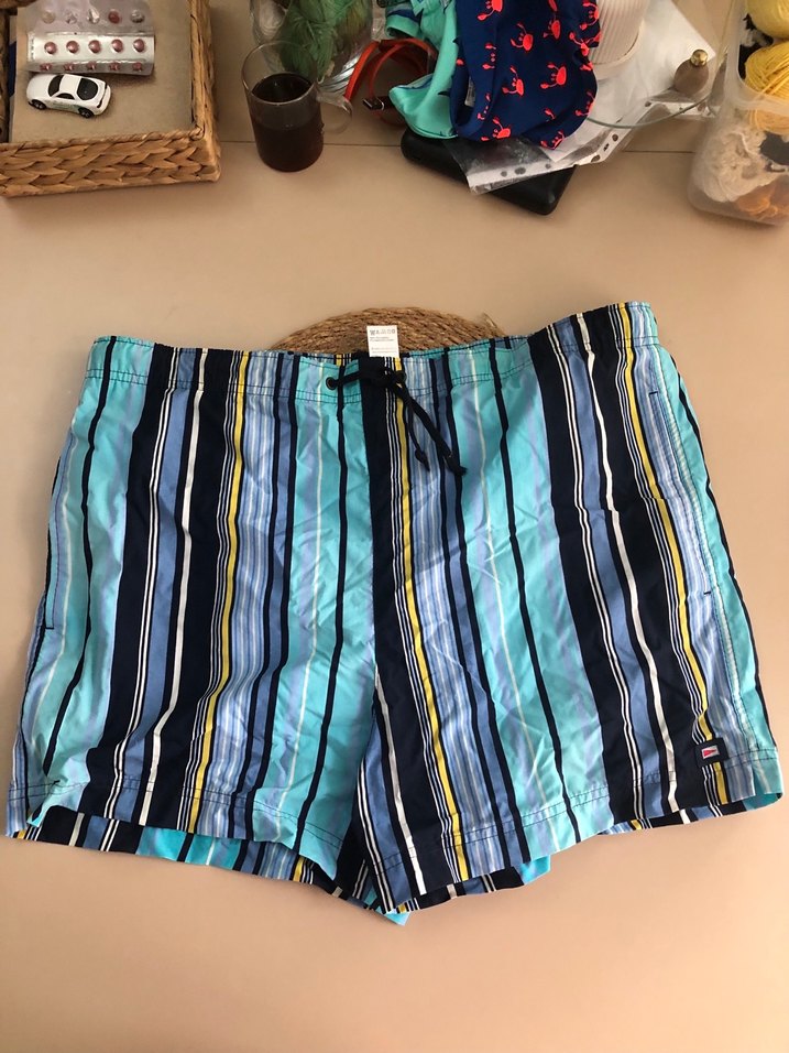 Pastel mavi tonlarında, dikey çizgili ve pileli tasarıma sahip, bol kesim erkek mini şort, plaj ve günlük kullanıma uygun.
