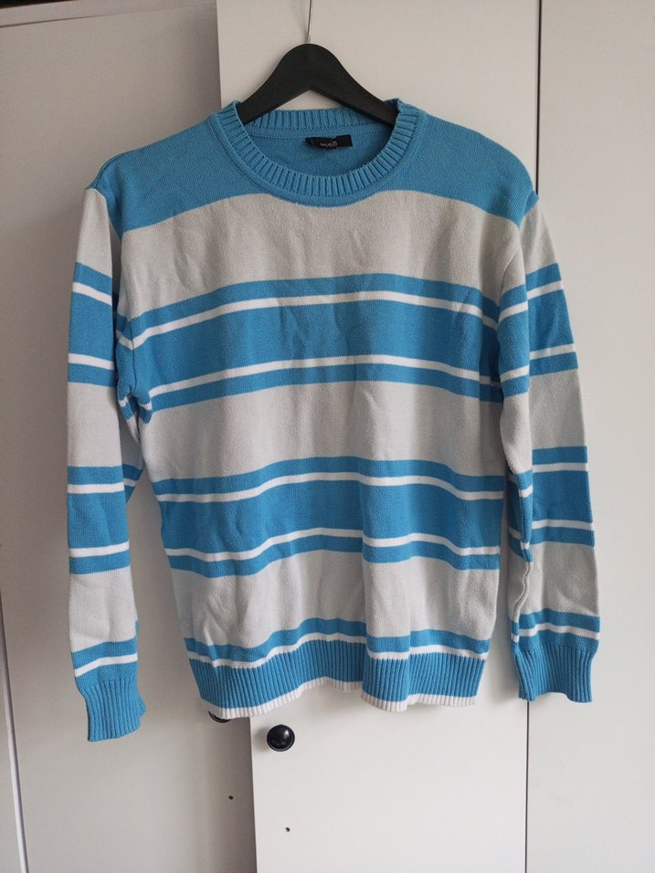 Uzun kollu, bisiklet yaka, örgü pamuk kumaştan erkek kazak. Mavi ve gri çizgili, bol kesim, sokak stiline uygun.