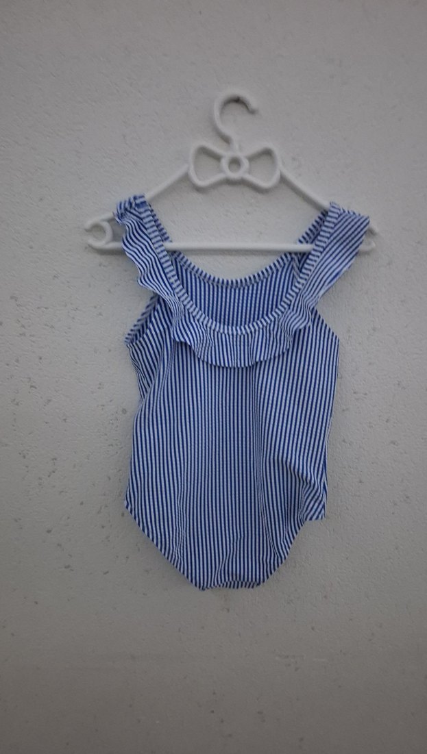 Mavi ve gri çizgili, kolsuz, fırfırlı ve tekne yaka bebek kız body. Sıcak günler için uygun.